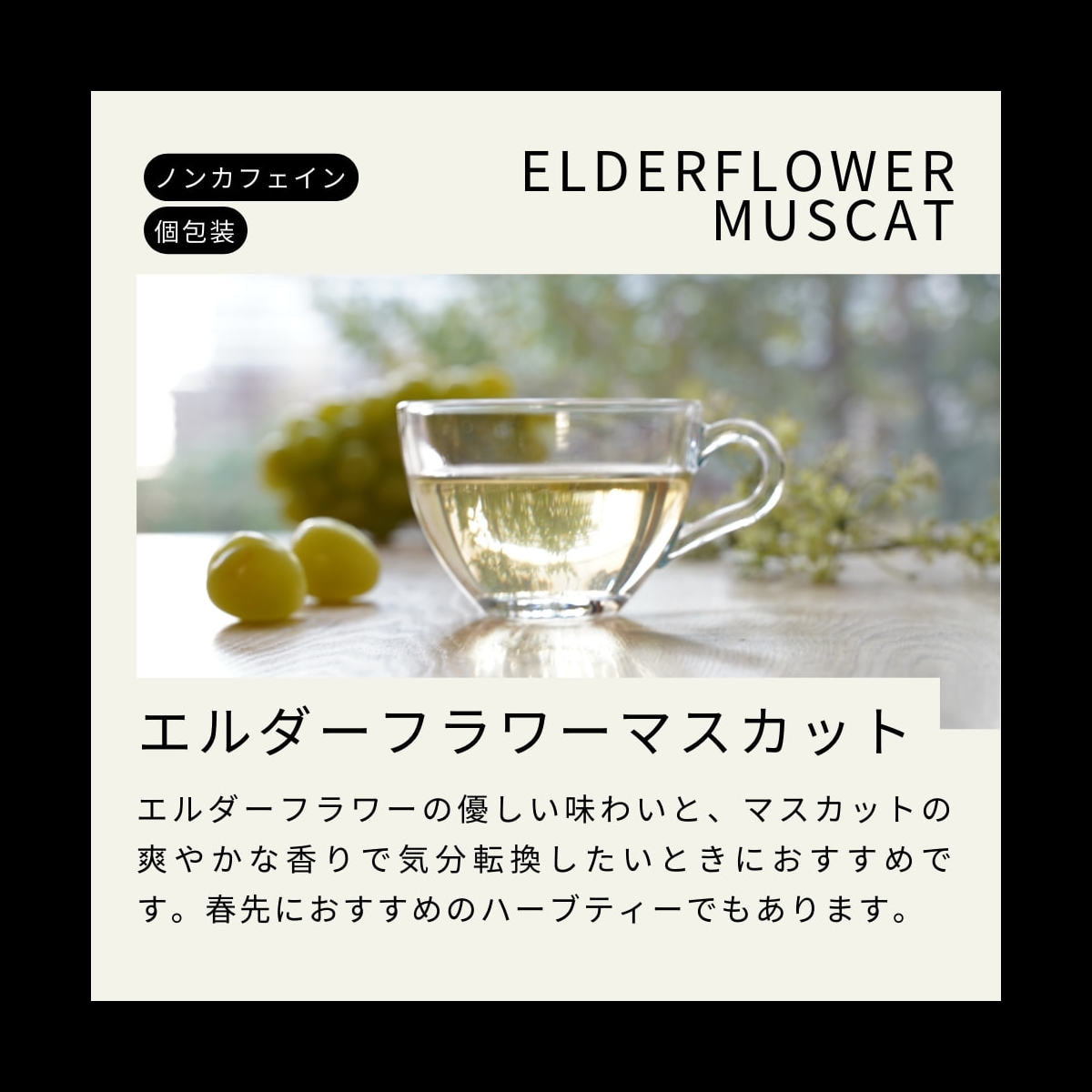 エルダーフラワーの優しい味わいと、マスカットの爽やかな香りのハーブティー