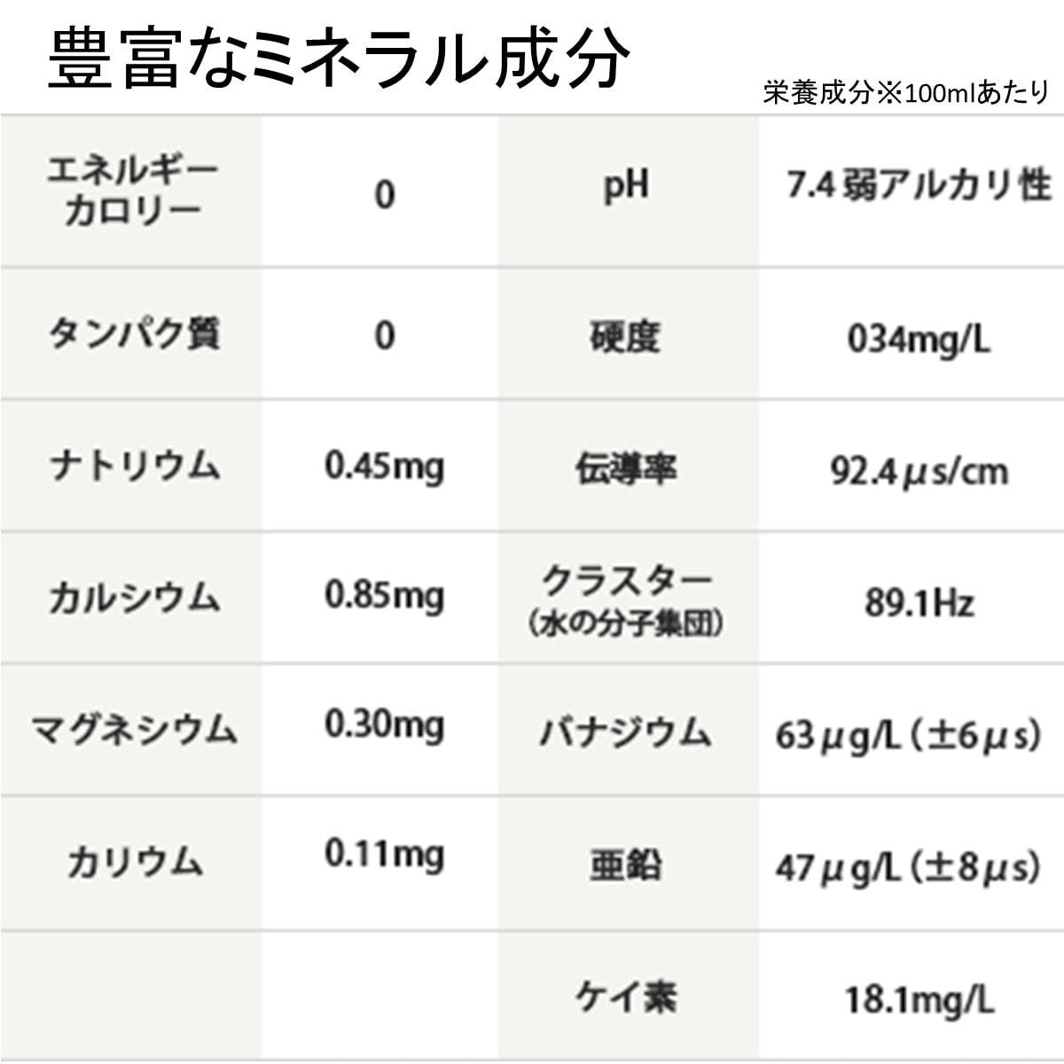 エネルギー0kcal、たんぱく質0g、脂質0g、炭水化物0g、ナトリウム0.4mg、マグネシウム0.3mg、カリウム0.1mg、ケイ素18.mg/L、バナジウム63μg/L(±6μg)、亜鉛47μg/L(±8μg)、pH7.4(弱アルカリ性)、硬度34mg/L